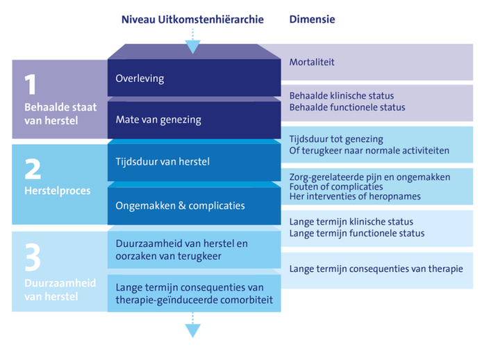Zowel patiënten als zorgverleners kunnen de resultaten die van belang zijn voor de patiënt registreren. Dit noemen we dan Patient Reported Outcome Measures of Provicer Reported Outcome Measures of Clinical Outcomes. Deze zijn samen te vatten in de uitkomstenhiërarchie. Wanneer we op de beste resultaten van zorg en de laagst mogelijke impact van een aandoening willen sturen, onderscheiden we drie belangrijke niveaus.